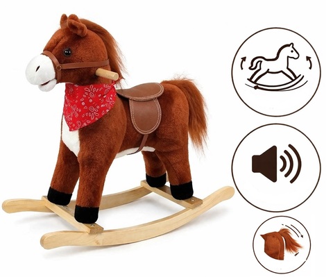 Heli, valguse ja sabaliigutusega kiikhobune, vaja on 3 x 1,5 V AA patareid. Kõrgus 58 cm, laius 28 cm, pikkus 68 cm.