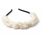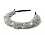 Materiaali: metalli, pörröinen kangas, satiinikangas, helmiä , vanteen leveys 0,6 cm, visuaalinen 2 cm.