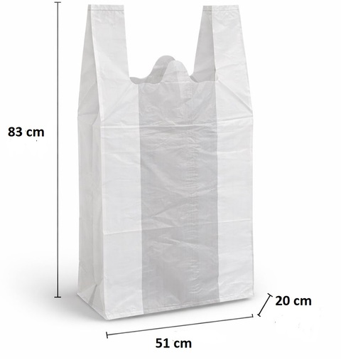 Vahvat valkoiset polyeteenipussit, joissa on kahvat Pussin pituus on merkitty kahvoilla.