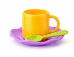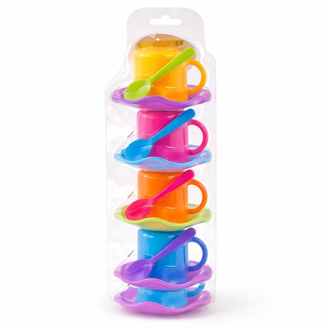 Lasten teetarjoilu sosiaalisia taitoja ja mielikuvitusta kehittävää leikkiä varten. Ihanteellinen ystävien juhliin. Materiaali: muovi Sisältää: 4 kuppia, 4 lautasta Sarjan mitat 28x11x10 cm Lautasen halkaisija 10 cm 8 kappaleen setti