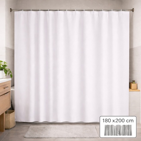 Hotelliverho valkoinen 180x200 cm. Vettä hylkiväši. Anti-homekäsittely. Pestävä useita kertoja Verhon alaosa on painotettu, jotta verhot roikkuvat tasaisemmin Verhon yläosassa on erityisesti upotetut narut verhojen kiristämiseksi Verhoklipsit eivät sisälly hintaan Kangas 210 g m2 (100 % polyesteriä). * Dušas verhot kiinnitetään koukuilla kiskoon