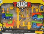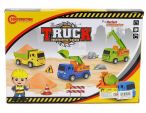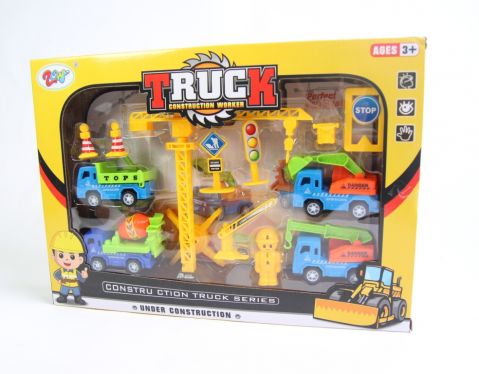 Komplekte yra 4 skirtingos statybinės transporto priemonės, kranas, statybininkas ir kelio ženklai. Medžiaga: plastikas. Pakuotės dydis: 37 x 26 x 5 cm