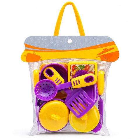 Rotaļu virtuves trauku komplekts somiņā . Komplekta izmēri: 14 x 14 x 3.5 cm. Komplektā 12 priekšmeti