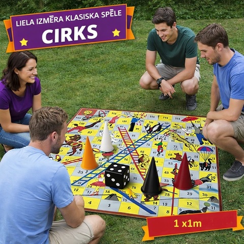 Laukuma spēle Cirks Klasiska spēle visai ģimenei. Centies nokļūt finišā pirmais! Spēle attīsta atmiņu, loģisko domāšanu un matemātikas prasmes. Ražots Latvijā Spēles laukuma izmēri: 1 x 1 m Somas izmērs 180 x 270 x170 mm Komplektā 1 gab. melns metamais kauliņš un 4 gab. dažādu krāsu ejamie kauliņi.