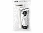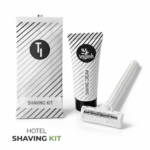 Försluten pappersförpackning. Innehåller en dubbelbladig rakkniv och en tub med 10 ml rakkräm. Förpackningen kan förses med logotyp